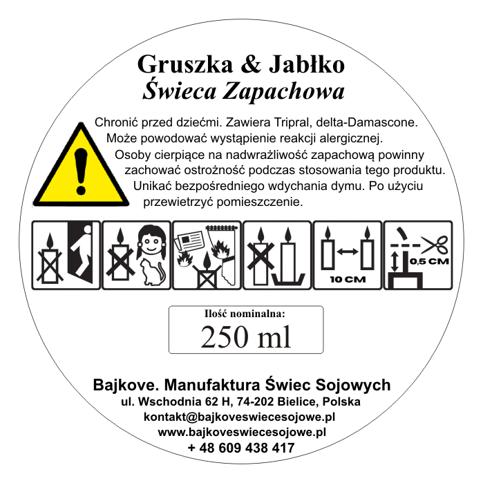 • skład: naturalny wosk sojowy, kompozycja zapachowa, bawełniany knot.