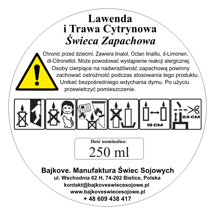 • skład: naturalny wosk sojowy, kompozycja zapachowa, bawełniany knot.